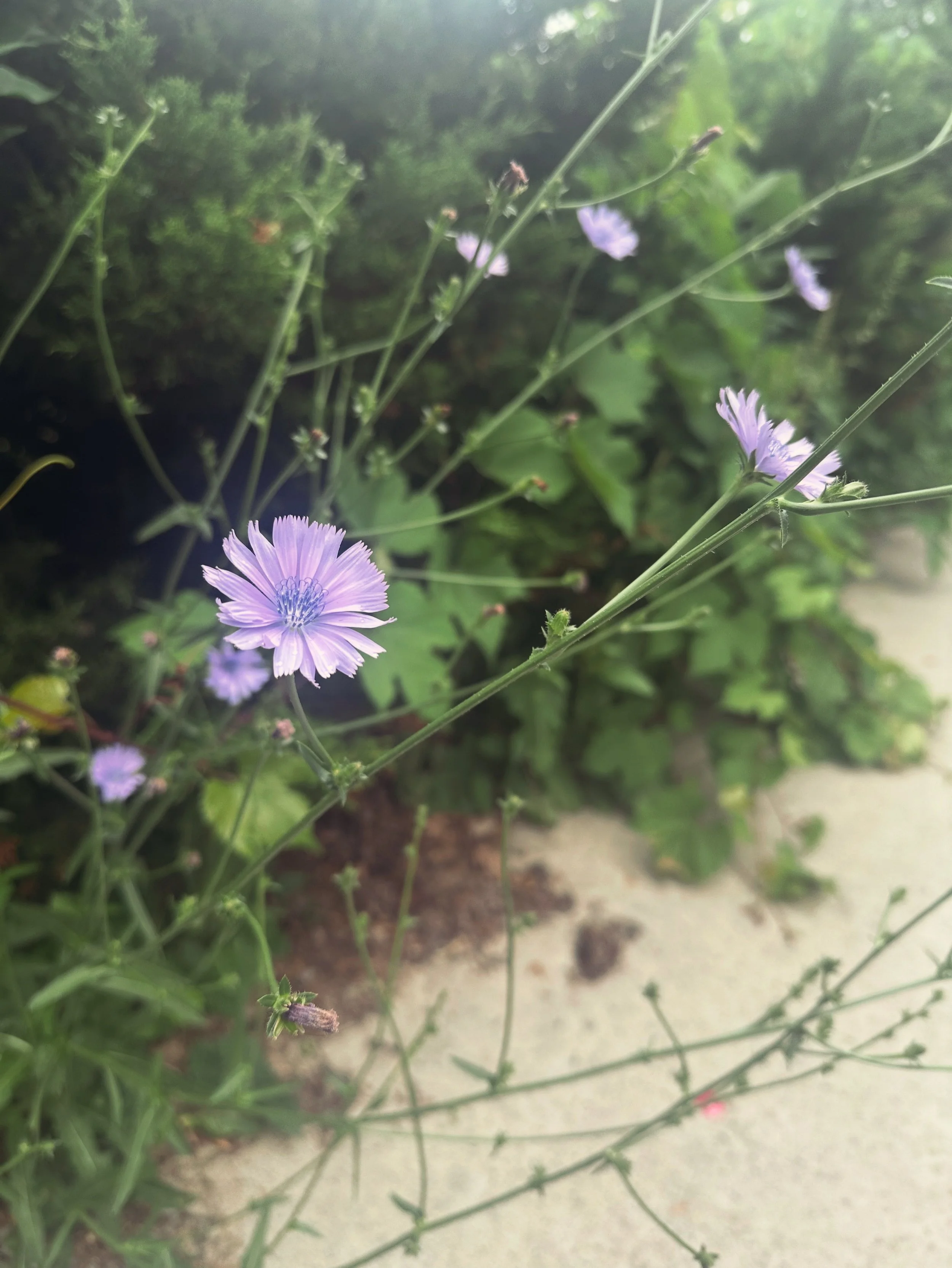 Walking past the college buildings, soft purple stalks caught my eye on the edge of the sidewalk. Delicate petals almost translucent in the sunlight, fanned out from a slender stem: chicory! I have never seen it in Vermont until now.